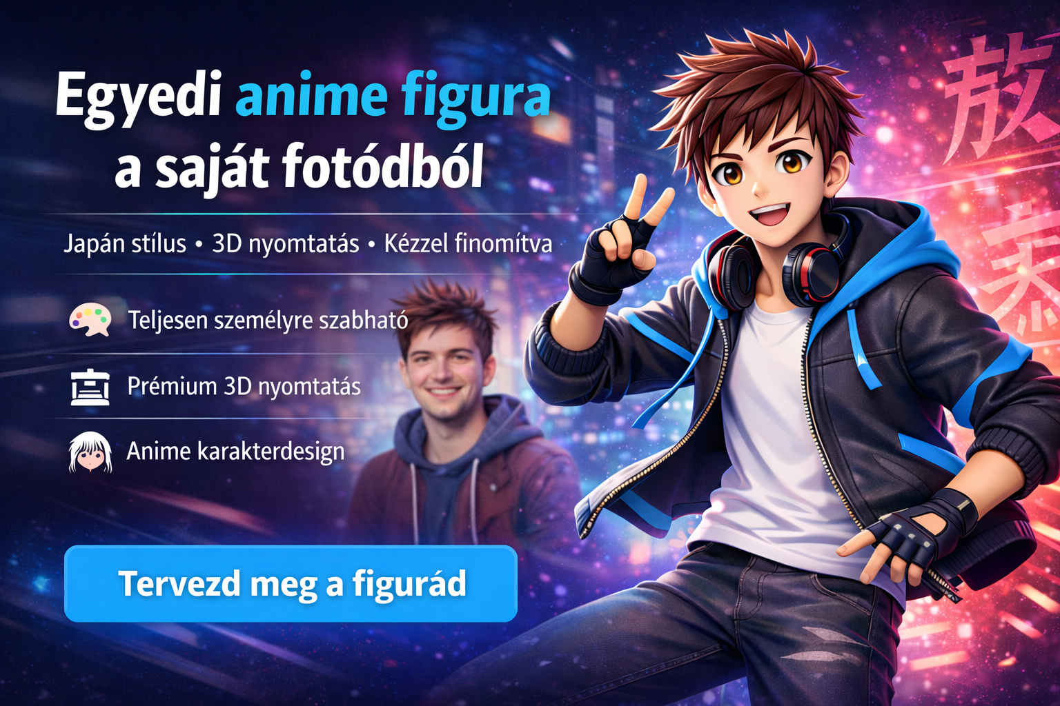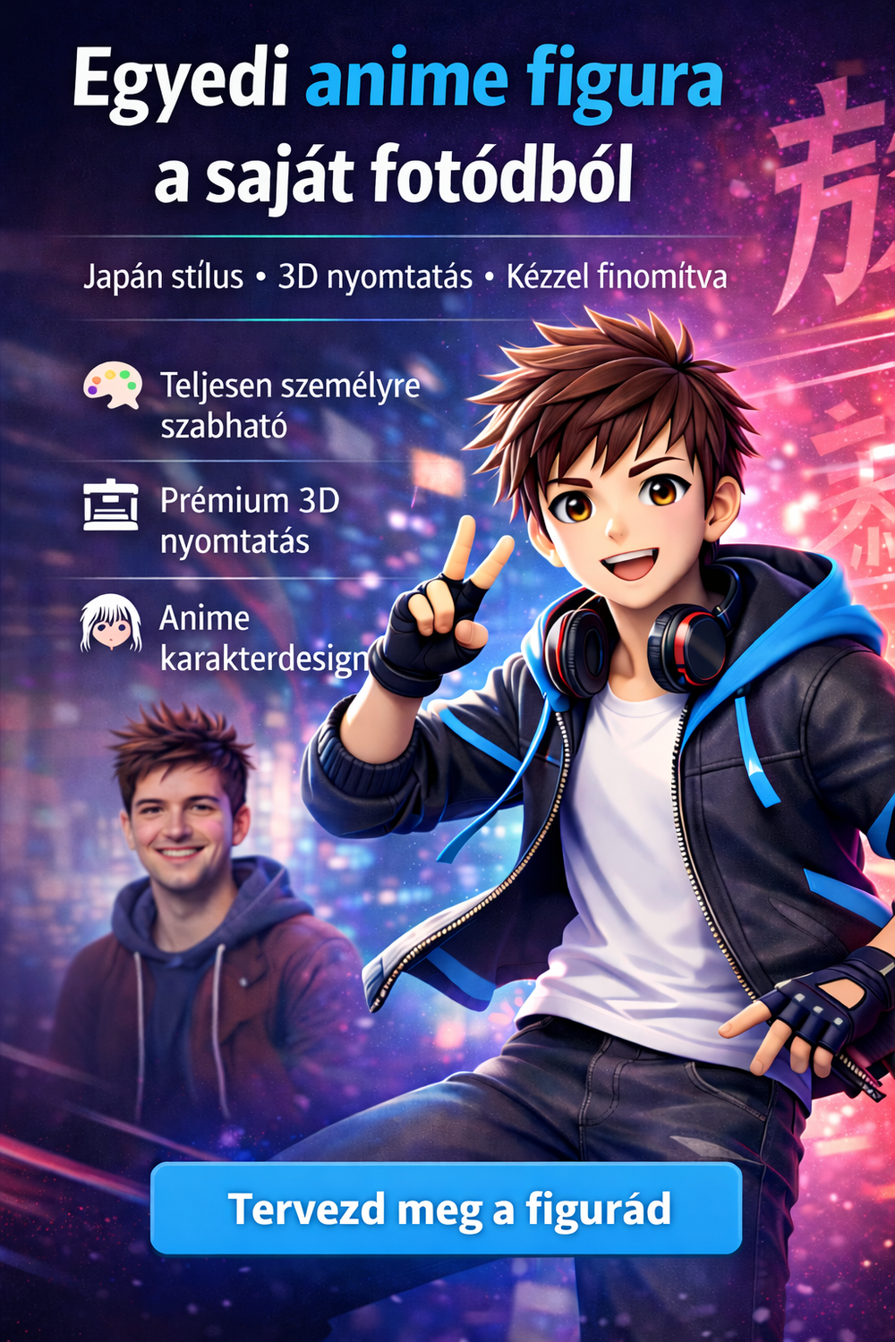 A fotók alapján elkészítjük az anime stílusú 3D modellt. Minden figura személyre szabott, emberi utómunkával készül.
